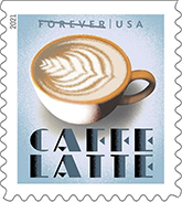 Espresso Drinks Forever Stamps America’s love of coffee is celebrated with four new stamps in a booklet of 20. Four digital illustrations feature cups of four different drinks: caffe latte, espresso, caffe mocha and cappuccino. The names of the espresso drinks appear in art-deco-inspired lettering above or below each cup. Art director Greg Breeding designed the stamps with original artwork by Terry Allen. |