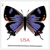 Colorado Hairstreak Butterfly Non-Machineable Surcharge Stamp The Colorado hairstreak graces the eighth nonmachinable butterfly stamp for use on irregularly sized envelopes, such as square greeting cards, invitations or announcements. The stamp art is a highly stylized, simplified image of a Colorado hairstreak (Hypaurotis crysalus). Artist Tom Engeman created the stamp art. Art director Derry Noyes designed the stamp. |