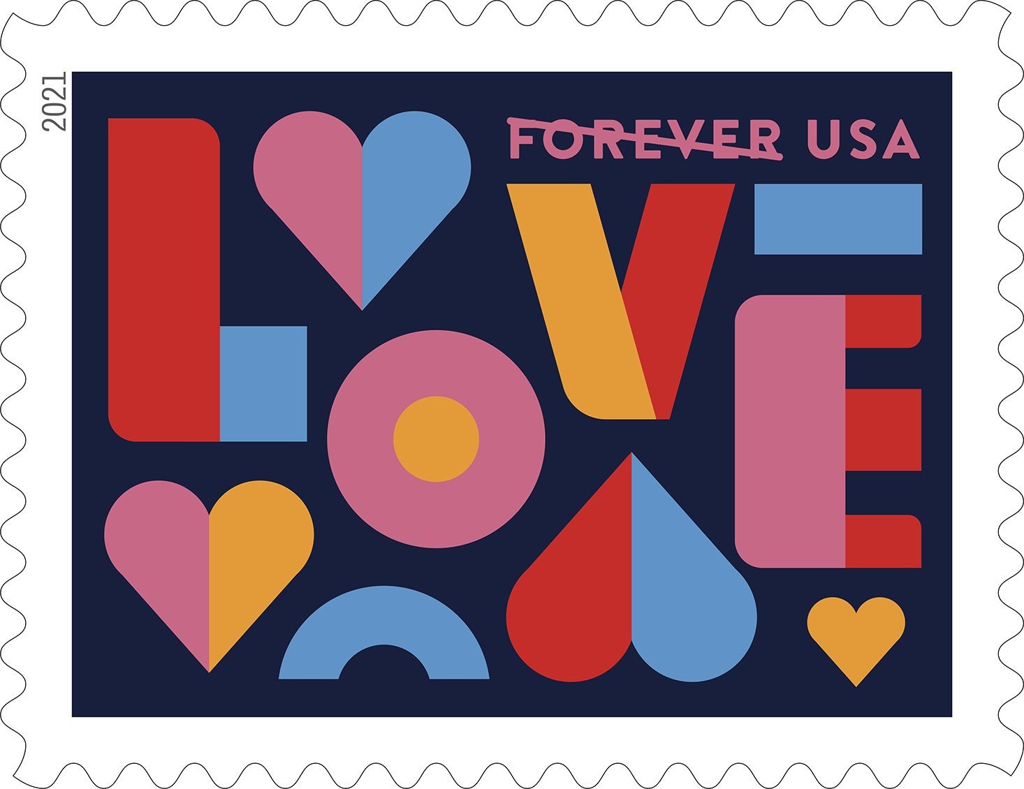 Love Forever Stamp The Postal Service continues its popular Love series with a stamp that features a lighthearted and colorful digital illustration of the word “LOVE” and three large hearts shown in an unconventional palette of color duos. Greg Breeding was art director; Bailey Sullivan created the original art and designed the stamp. The Loveland First Day of Issue site was particularly appropriate at a time when on-site ceremonies cannot be held. Every year, more than 100,000 valentines, packaged inside larger envelopes, are sent to Loveland, where volunteers handstamp them with a Valentine’s Day verse and send them on to the intended recipients. Thus we have the use of the mails to share feelings with friends and loved ones at a time when we might not be able to be with them in person. |