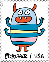 Message Monsters Forever Stamps The four fun designs on this new pane of 20 stamps are supplemented by dozens of self-adhesive accessories in the margin around the stamps. With them, you can surprise recipients with personalized cards, letters and envelopes. Decorations include hearts, hats, voice balloons, flowers and thought bubbles. Art director Antonio Alcalá designed the pane with new illustrations by Elise Gravel. |