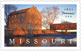 Missouri Statehood Forever Stamp This stamp celebrates the bicentennial of Missouri statehood. Missouri became the 24th state in the Union on Aug. 10, 1821. The stamp art is an existing photograph of Bollinger Mill State Historic Site by noted landscape photographer Charles Gurche. Art director Greg Breeding designed the stamp. |