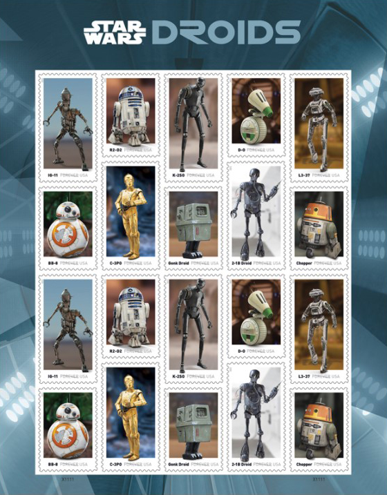 Star Wars Droids Forever Stamps The first characters fans meet in the first “Star Wars” film, “Star Wars: A New Hope,” are droids — namely C-3PO and R2-D2 — and droids have continued to play pivotal roles throughout the “Star Wars” galaxy. With that in mind, the Postal People have announced that on May 4 in a Virtual Ceremony their second Star Wars issue will salute the “beloved droids from the Star Wars galaxy and the imagination that brings these technological marvels to the screen. Representing more than four decades of innovation and storytelling, the droids featured . . . " Continue reading New Star Wars Sheet Coming This Spring [PDF Document] |