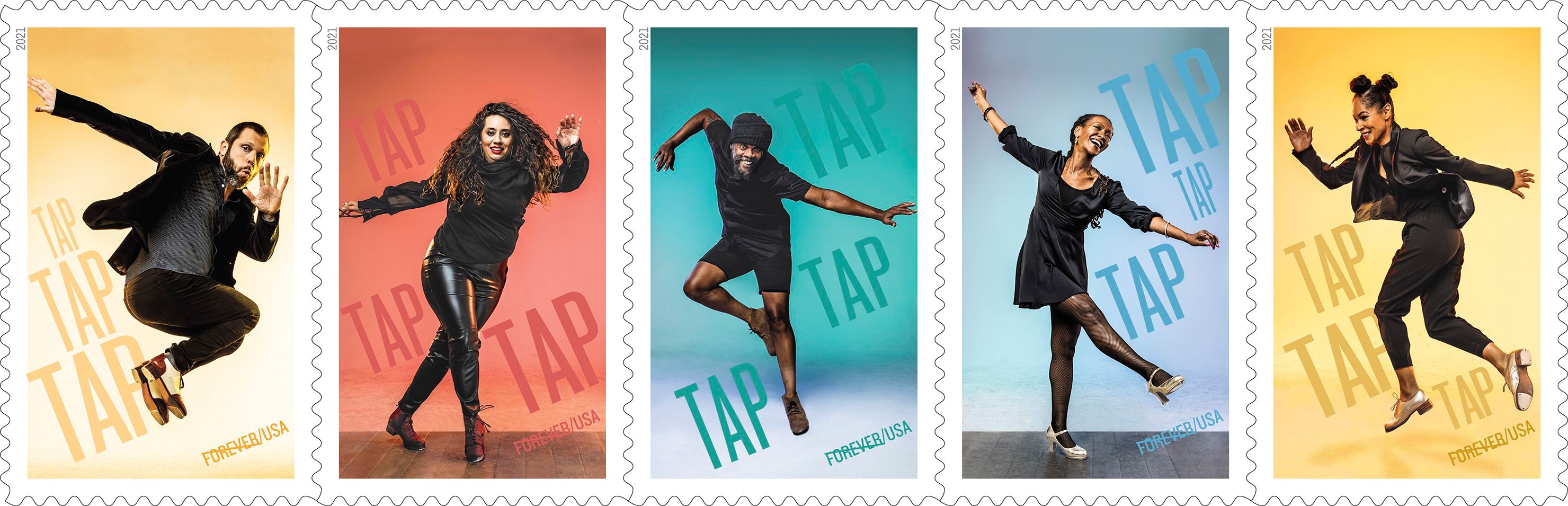 Tap Dance Forever Stamps These stamps celebrate tap dancing as a uniquely American contribution to world dance. Its roots were in minstrel shows, it gained prominence in vaudeville, then emerged into an art form and means of expression alongside the evolution of jazz. These five stamps feature photographs of different tap dancers performing against brightly colored backgrounds that highlight their form and movement. However, instead of generic images, the Postal Service could have depicted any number of famous tap dancers, such as Bill "Bojangles" Robinson, John W. Bubbles, Charles “Honi” Coles, Ann Miller, The Nicholas Brothers, Gene Kelly, Ginger Rogers and Fred Astaire,Gregory Hines, and many more. While a few have already been honored on stamps, they would still be fitting on Tap Dance stamps. |