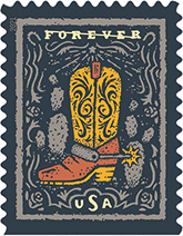 Western Wear Forever Stamps The U.S. Postal Service celebrates the enduring legacy of Western wear with four fun new Forever stamps in a booklet of 20. The stamp art features four graphic illustrations of Western wear staples — a cowboy hat, a cowboy boot with a spur, a Western shirt, and a belt buckle featuring a longhorn head. Each image is framed by elements common to the American West and iconography of the region, including cacti, snakes, roses and stars. Art director Greg Breeding designed the stamps with original art by Ryan Feerer. |