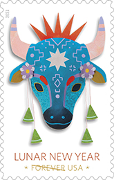 Lunar New Year • Year of the Ox Forever Stamp In 2021, the Postal Service will issue the second of 12 stamps in a new series of Lunar New Year stamps. Calling to mind the elaborately decorated masks used in the dragon or lion dances often performed during Lunar New Year parades, these three-dimensional masks are a contemporary take on the long tradition of paper-cut folk art crafts created during this auspicious time of year. Art director Antonio Alcalá designed the stamp with original art by Camille Chew. |