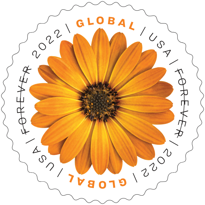 African Daisy Global Forever Rate Stamp This round, Global stamp can be used to mail a 1-ounce letter or postcard to any country to which First-Class Mail International service is available. This Forever stamp will have a postage value equivalent to the price of the single-piece First-Class Mail International 1-ounce machineable letter in effect at the time of use ($1.30 as of January 1, 2022). The latest version of the Global Forever Rate issues features the intricate design of a colorful African daisy, photographed from above. Native to southern Africa and often called the African daisy, plants from the Osteospermum genus are widely available in U.S. nurseries. Greg Breeding designed the stamp with existing photography by Cindy Dyer. William Gicker was the art director. |