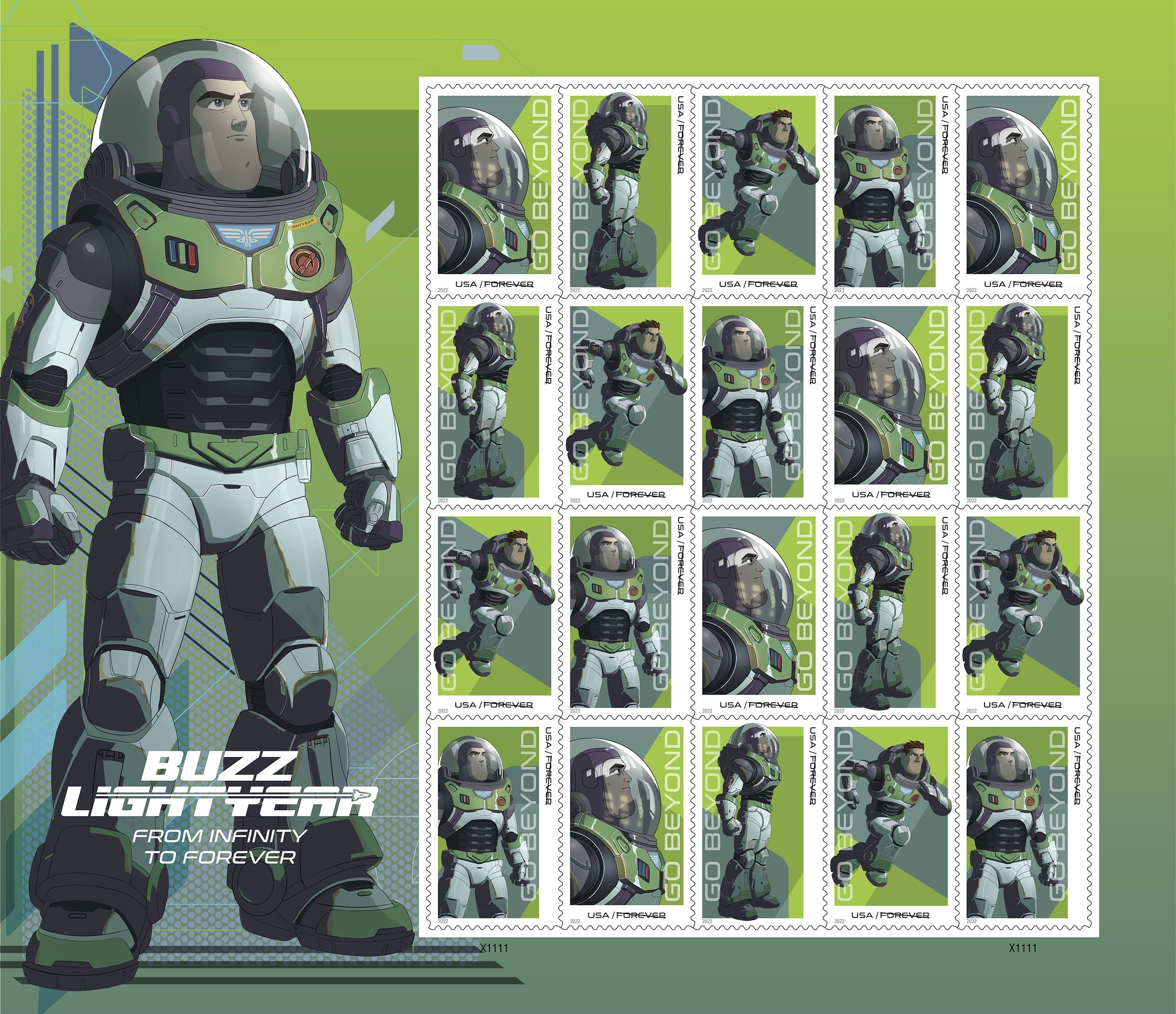Buzz Lightyear Forever Stamps Previewed on June 8 at the red-carpet premiere of Disney and Pixar’s "Lightyear," the new movie featuring Buzz Lightyear, this pane of 20 stamps, is titled “Go Beyond” by the USPS, with that name on each stamp. The fictional character is a Space Ranger superhero, part of the highly popular Toy Story franchise. He was given the name Buzz in honor of Apollo 11 astronaut Edwin “Buzz” Aldrin, the second person to walk on the Moon. |