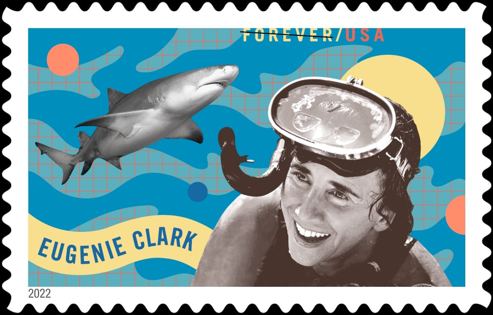 Eugenie Clark Forever Stamp Affectionately known as the “Shark Lady,” pioneering marine biologist Eugenie Clark (1922-2015) spent her career working tirelessly to change public perception about sharks as well as to preserve marine environments around the world. The stamp art features a digital collage, including a photograph of Clark and a lemon shark. Wavy blue elements in the background evoke an undersea scene. |