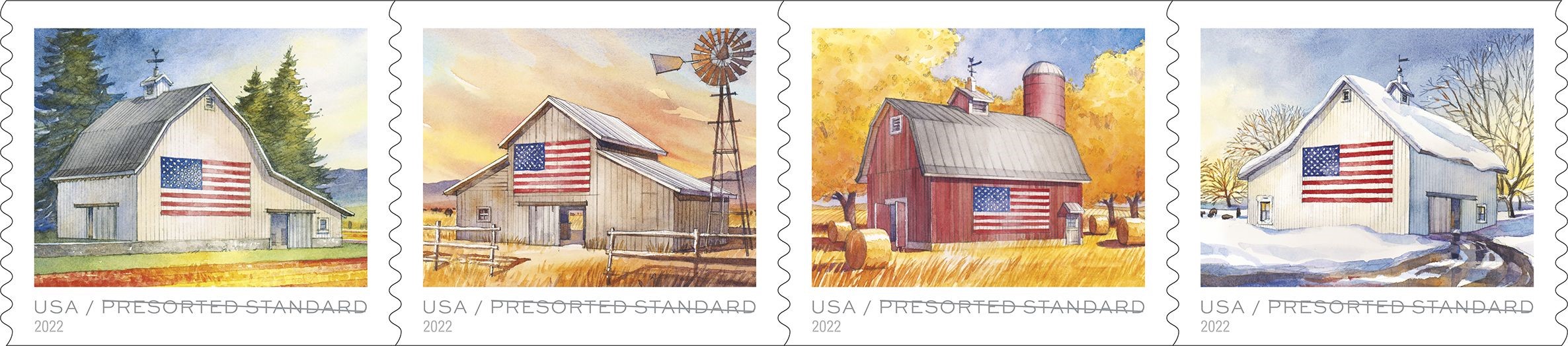 Flags on Barns Presort Standard Rate Stamps Painted flags can be found on barns in almost every region of the United States. Four colorful pencil and watercolor illustrations of flags on barns grace the latest issuance of stamps available for bulk-mail users. The barns are set in landscapes inspired by the seasons and different regions of the United States. Stephanie Bower designed and illustrated the stamps. Antonio Alcalá was the art director. When a mailer presorts mail so that it is sorted to the finest extent required by the standards of the price claimed, the benefit is significant savings on postage as the mailer is doing some of the work Postal People would otherwise have to do. |