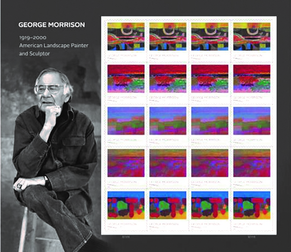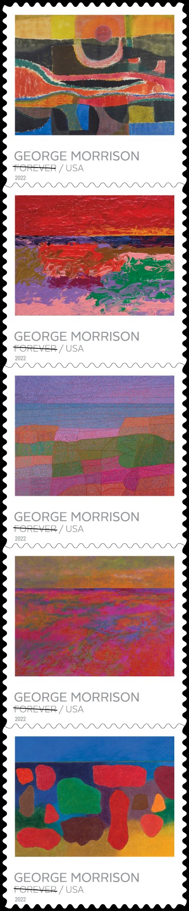 George Morrison Forever Stamps One of the nation’s greatest modernist artists and a founding figure of Native American modernism, George Morrison (1919-2000) challenged prevailing ideas of what Native American art should be, arguing that an artist’s identity can exist independently from the nature of the art he creates. Morrison is best known for his abstract landscapes and monumental wood collages. A pane of 20 colorful stamps showcases five of Morrison’s artworks. |