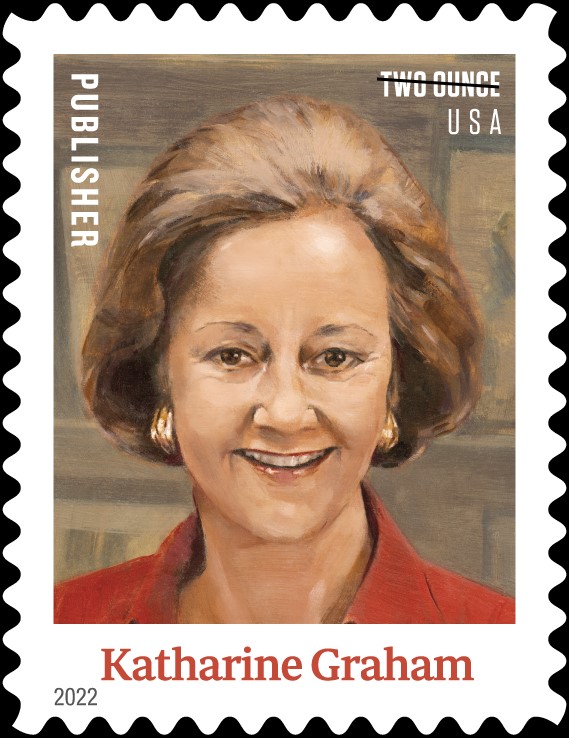 Distinguished Americans, Katharine Graham, Two-Ounce Stamp The 17th stamp in the Distinguished Americans series honors Katharine Graham (1917-2001), the first female head of a Fortune 500 company and a pivotal figure during turbulent moments in American history. The stamp features an oil portrait of Graham, based on a photograph taken in the 1970s, during the peak of her influence as owner and president of The Washington Post Co., where she was also publisher of its flagship newspaper. Art director Derry Noyes designed the stamp with original art by Lynn Staley. |