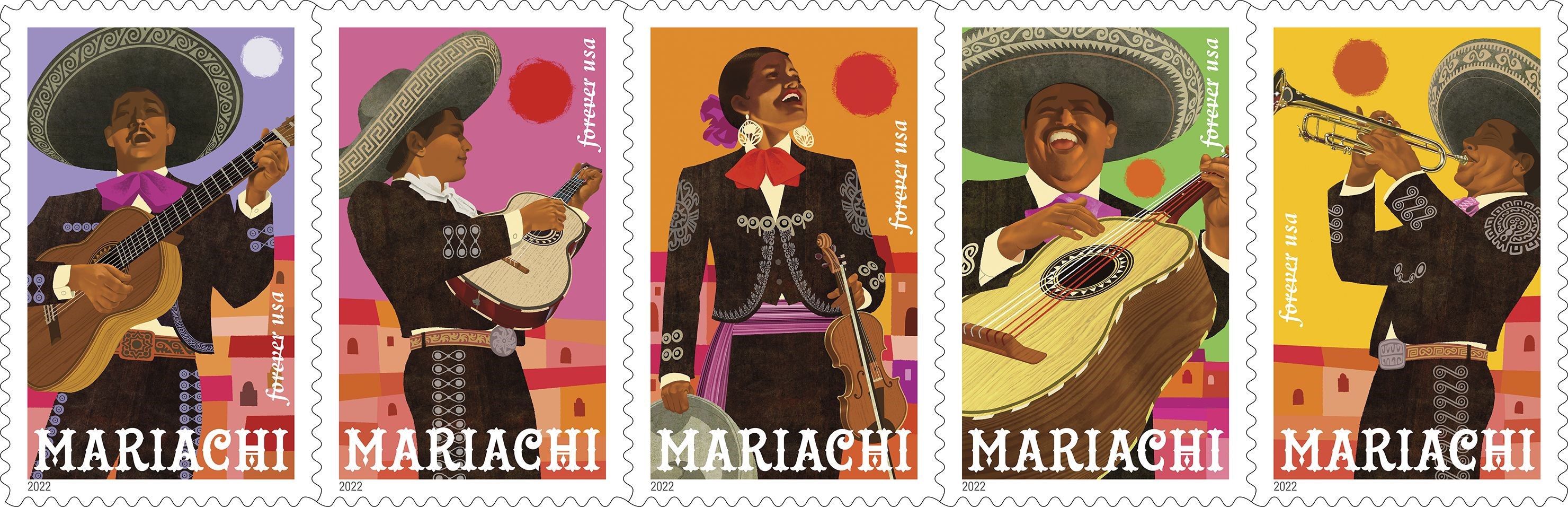 Mariachi Forever Stamps Filled with passion, rhythm and stories of life, love and loss, mariachi music is an integral element of Mexican American culture that has become deeply rooted in the United States and has fans around the world. Each of the five stamps in this pane of 20 features a musician dressed in a traje de charro, the traditional outfit of mariachi performers, playing one of five iconic mariachi instruments: a guitar, an acoustic bass guitar called a guitarrón, a high-pitched stringed instrument known as a vihuela, a violin and a trumpet. Rafael López designed the stamps and created the art. Derry Noyes was the art director. The July 15 first day of issue coincides with the opening day of the 2022 Mariachi Spectacular Showcase, with performances from elementary school to open competition winners, who travel to Albuquerque to perform. |