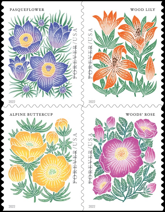 Mountain Flora Forever Stamp These four new stamps celebrate the beauty of mountain flowers. Each Mountain Flora stamp features a different flower: a purple pasqueflower, an orange-red wood lily, a bright yellow alpine buttercup and a dark pink Woods’ rose. The artist’s hand-drawn illustrations, refined digitally, create a block-print aesthetic. |