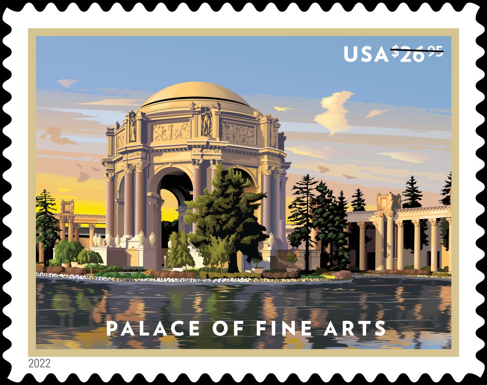 Palace of Fine Arts $26.95 Express Mail Stamp An eye-catching sight in the Marina District of San Francisco, the Palace of Fine Arts has long been a source of pride for residents and an attraction for visitors from around the world. This Priority Mail Express stamp celebrates the iconic architectural landmark. The stamp features a digital illustration showing the rotunda and part of the colonnades of the Palace of Fine Arts, with a small lagoon in the foreground. Art director Greg Breeding designed the stamp with original art by Dan Cosgrove. It was originally constructed for the 1915 Panama-Pacific Exposition, which was previewed on a set of 1913 U.S. stamps. Completely renovated between 1964 and 1974, it is now a commercially operated venue that is available for weddings, corporate, and other events. |