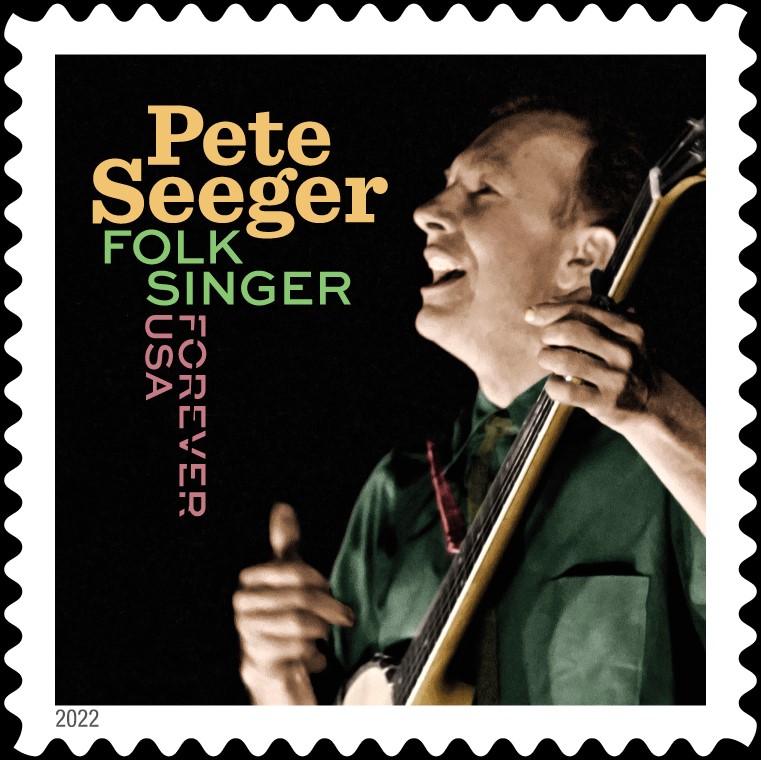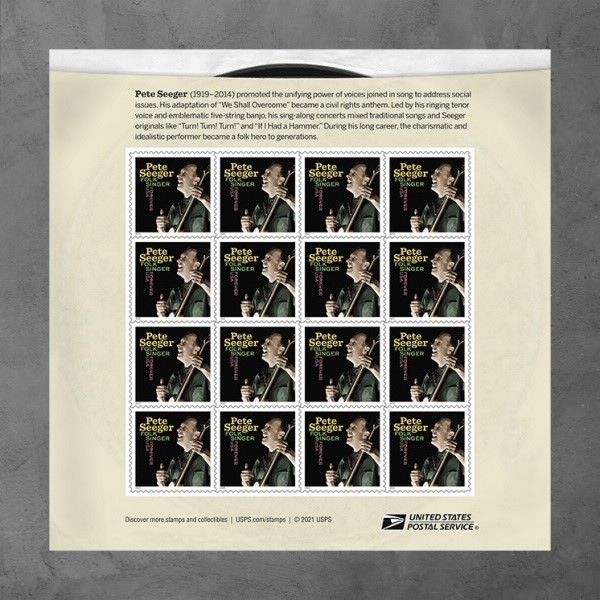 Pete Seeger Forever Stamps The 10th stamp in the Music Icons series honors Pete Seeger (1919-2014), a champion of traditional music and its power to inspire activism. Seeger’s clear tenor voice, iconic banjo and enormous charisma transformed concerts into singalongs. The stamp art features a color-tinted black-and-white photograph of Seeger singing and playing his banjo in the early 1960s, by Dan Seeger, the performer’s son. One side of the pane includes 16 stamps and the image of a sliver of a record seeming to peek out the top of the sleeve. A larger version of the stamp art photograph appears on the reverse side. Pete Seeger played a key role in the founding and growth of the world-famous Newport Folk Festival. |