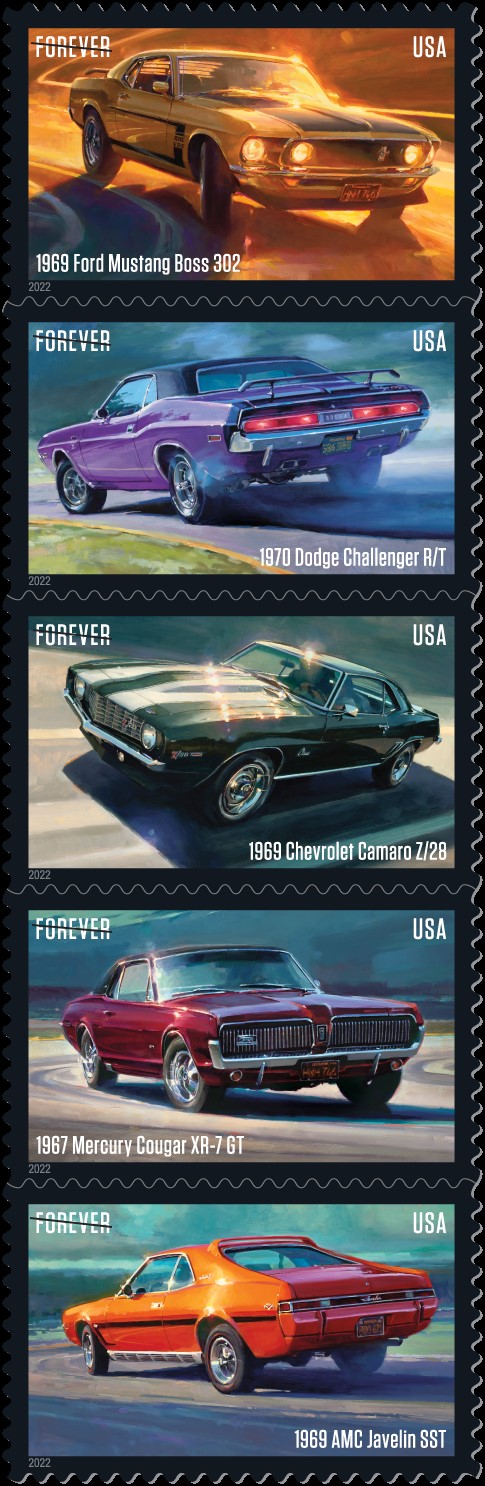 Pony Cars Forever Stamps Over the past six decades, pony cars have become a uniquely American obsession, bringing a youthful spirit to the automotive world. These stamps celebrate five iconic U.S. automobiles — the 1969 Ford Mustang Boss 302, the 1970 Dodge Challenger R/T, the 1969 Chevrolet Camaro Z/28, the 1967 Mercury Cougar XR-7 GT and the 1969 AMC Javelin SST. The bold and dramatic artwork, painted with oils on panel, captures the energy and mystique of pony cars. |