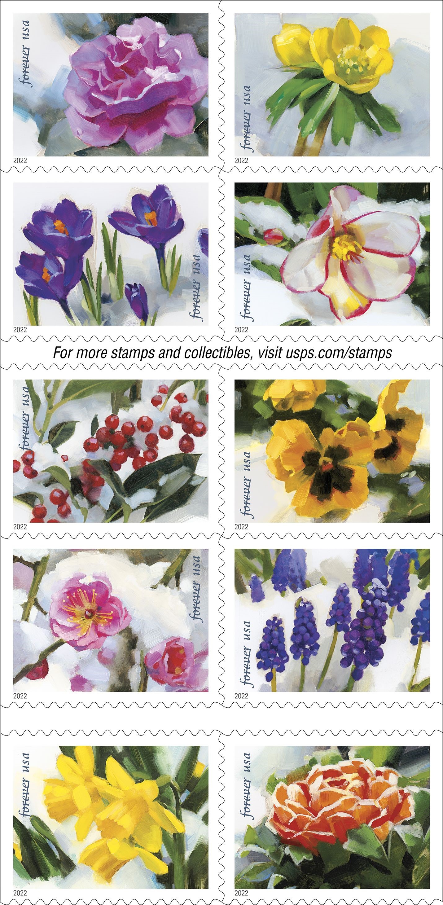 Snowy Beauty Forever Stamps Bringing to 24 the number of U.S. 2022 stamps devoted to floral themes, these stamps celebrate the warmth and cheer that flowers and berries bring to our natural landscapes, even after a surprise snow. In these hand-sketched and painted designs, the artist uses light, shadow and luminous color to evoke the beauty of 10 species: camellia, winter aconite, crocus, hellebore, winterberry, pansy, plum blossom, grape hyacinth, daffodil and ranunculus. Derry Noyes designed the stamps with original oil paintings by Gregory Manchess. |