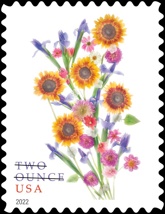 Sunflower Bouquet Two-Ounce Stamp The Sunflower Bouquet 2-ounce stamp features an array of sunflowers, irises and other small flowers priced to accommodate the weight of heavy invitations, oversize greeting cards and other mailings that require extra postage. The Sunflower Bouquet stamp is similar in design to the new Tulips Forever stamp, and the two form a natural pair. |