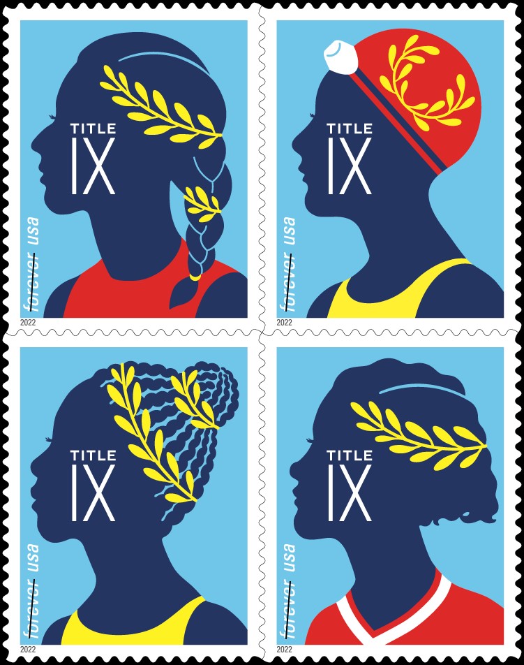 Title IX Forever Stamp This stamp release commemorates the 50th anniversary of the passage of Title IX, the civil rights law prohibiting discrimination on the basis of sex in any educational program or activity receiving federal financial assistance. Applied at educational institutions over a wide range of programs, its most visible impact has been on school athletics. Four different stamps feature dark blue silhouettes of one of four female athletes: a runner, a swimmer, a gymnast and a soccer player. Yellow laurel branches, symbolic of victory, rest in their hair and on the swimmer’s cap. |