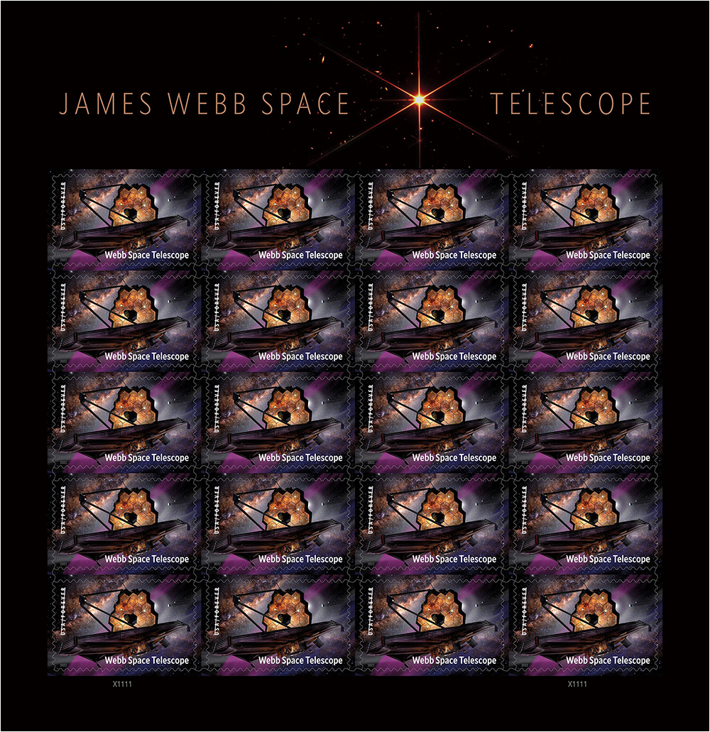 James Webb Space Telescope Forever Stamp This stamp recognizes NASA’s James Webb Space Telescope. The largest and most complex telescope ever deployed in space, it is capable of peering directly into the early cosmos and studying every phase of cosmic history. Launched on Dec. 25, 2021, Webb now orbits the Sun about a million miles away from Earth. The image on the stamp is an artist’s digitally created depiction of the telescope against a dazzling starscape. A photograph of a star and distant space in the full pane margin was taken by Webb early in its mission, brilliantly confirming the perfect alignment of the telescope’s 18 mirror segments. Art director Derry Noyes designed the stamp using existing art by James Vaughan and an image provided by NASA/Space Telescope Science Institute. |