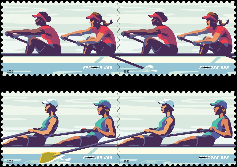 Women’s Rowing Forever Stamps These stamps celebrate women’s rowing, a graceful but demanding sport in which American women have excelled, including in the Olympics. The artwork, which covers the entire pane, is a stylized illustration of five eight-person rowing teams competing or practicing. Four stamp designs are featured in a pane of 20 stamps arranged as five staggered rows of four. |