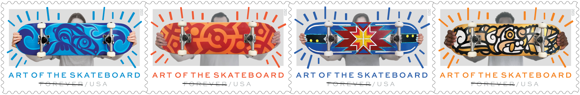 Art of the Skateboard Forever Stamps These four stamps celebrate the Art of the Skateboard with vibrant designs that capture skateboarding’s excitement. Art director Antonio Alcalá designed the stamp issuance using photographs of skateboards created by Crystal Worl, an Alaskan whose blue and indigo salmon formline design expresses her Tlingit/Athabascan heritage; William James Taylor Jr. of Virginia, who created an energetic red and orange graphic abstraction; Colombian-born, Washington, D.C. muralist MazPaz (Federico Frum), who painted a stylized jaguar; and Di’Orr Greenwood of Arizona who represents her Navajo culture with a turquoise-inlaid skateboard that features eagle feathers and colors of the rising or setting sun. Di’Orr Greenwood’s design is shown to the left (presumably being held by Di’Orr.) |
