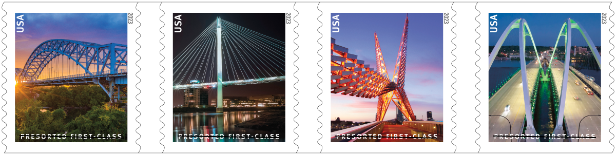 Bridges Presorted First-Class Mail Stamps Four new Presorted First-Class Mail stamps will be available for purchase by bulk mail users in coils of 3,000 and 10,000. The stamps feature existing photographs of four different bridges that range from modern to historic, pedestrian to car-carrying, but all are important landmarks in their communities. They are the Arrigoni Bridge in Middletown, Conn.; the Bob Kerrey Pedestrian Bridge in Omaha, Nebr.; the Skydance Bridge in Oklahoma City; and the Iowa-Illinois Memorial Bridge in Bettendorf, Iowa, and Moline, Ill. |