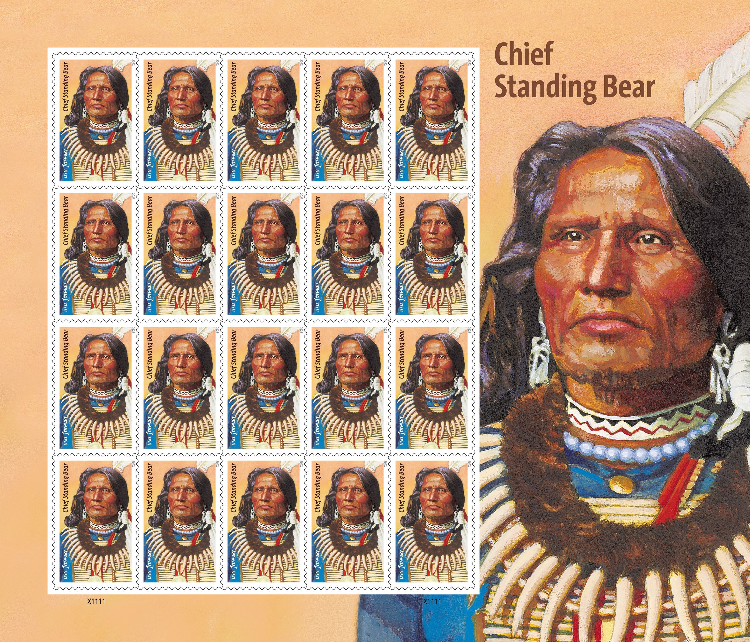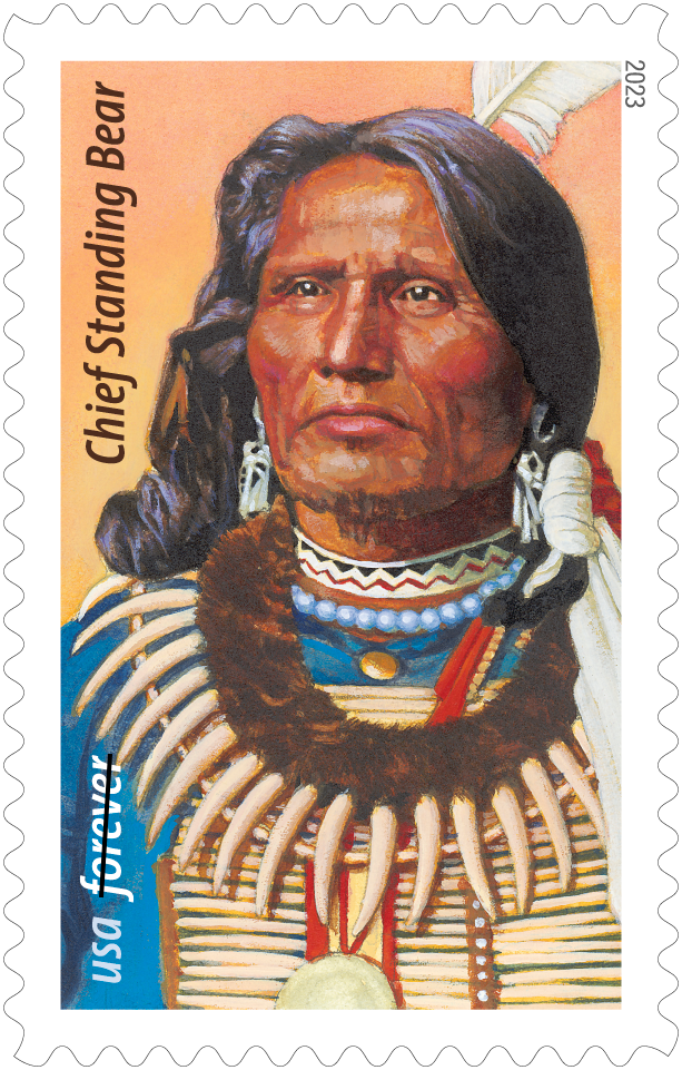 Chief Standing Bear Forever Stamp This stamp issuance honors Chief Standing Bear (ca. 1829-1908), who won a landmark court ruling in 1879 that determined that Native Americans were persons under the law with inherent rights to life, liberty and the pursuit of happiness. The stamp features a portrait of Chief Standing Bear by Thomas Blackshear II, based on a black-and-white photograph taken in 1877. The color of Standing Bear's attire was based mainly on contemporary descriptions. Art director Derry Noyes designed the stamp. Standing Bear was Chief of the Ponca tribe and led their court fight. The landmark case was motivated by a move of the Nebraska-based tribe to a reservation in Oklahoma, when the tribe thought they were being moved to Omaha, Nebraska. It resulted in the restoring the Ponca Tribe to northeastern Nebraska, while also retaining a Ponca Tribe in Oklahoma. In Lincoln, Nebraska, there is a city park located in the southwest area of town named "Standing Bear Grounds". One issue that his 1879 trial had raised was finally resolved in 1924 when Congress adopted the Indian Citizenship Act, which conferred citizenship on all Native Americans born in the United States. |