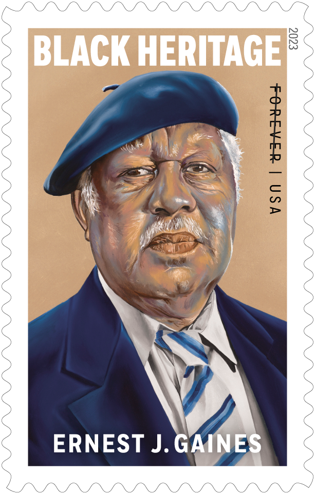 Ernest J. Gaines Black Heritage Forever Stamp The 46th stamp in the Black Heritage series honors Ernest J. Gaines (1933-2019). Best known for such novels as "The Autobiography of Miss Jane Pittman" and "A Lesson Before Dying," Gaines drew from his childhood as the son of sharecroppers on a Louisiana plantation to explore the untold stories of rural African Americans, adding a vital voice to American literature. The stamp features an oil painting of Gaines, based on a 2001 photograph. Mike Ryan designed the stamp with art by Robert Peterson. Greg Breeding served as art director. The University of Louisiana at Lafayette is home to the Ernest J. Gaines Center, which offers scholars valuable archival resources to conduct their research, as well as educational tools that provide historical resources about Gaines that in a digital archive that allows research of Gaines' work possible from around the globe. |