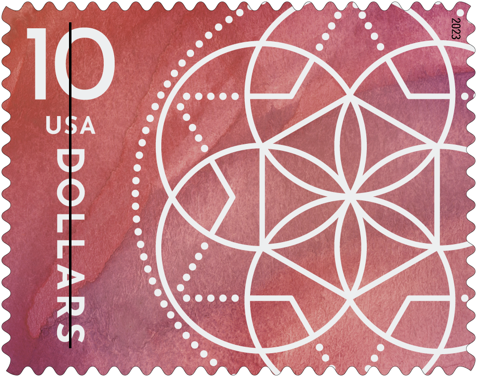 $10 Floral Geometry Stamp A new Floral Geometry stamp, denominated at $10, will be available for purchase, complementing the similarly designed $2 and $5 stamps issued in 2022. The stamps lend an elegant and contemporary appearance to packages, large envelopes and other mailings. The stamp art features a series of overlapping geometric shapes that mimic the symmetry of floral patterns found in nature. According to the Postal People, “the watercolor background and the glimmer of the foil-stamped design and typography create a sophisticated look.” The stamp will be issued in panes of four. The stamps were designed and created by the firm Spaeth Hill. Antonio Alcalá was the art director. |