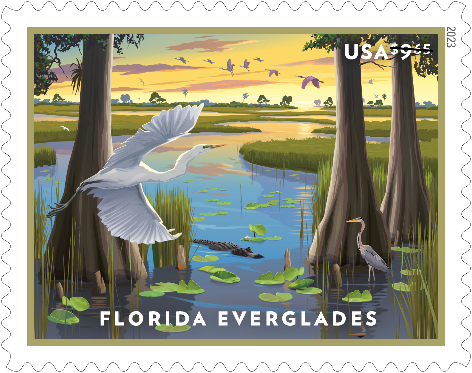 Florida Everglades $9.95 Priority Mail Stamp Spanning some 2 million acres in southern Florida, from Lake Okeechobee to Florida Bay, the Everglades is one of the largest wetlands in the world and the most significant breeding ground for tropical wading birds in North America. This new Priority Mail stamp celebrates the Florida Everglades with stamp art that shows a sawgrass marsh as seen at sunset from the edge of a cypress dome. Designed by art director Greg Breeding, the stamp showcases a digital illustration by Dan Cosgrove. The Florida Everglades Priority Mail stamp will be issued in Homestead, Fla., on Jan. 22 without a ceremony. The Everglades National Park’s Visitors Center is named after Ernest F. Coe, who was a leading advocate for the establishment of the Everglades National Park. |