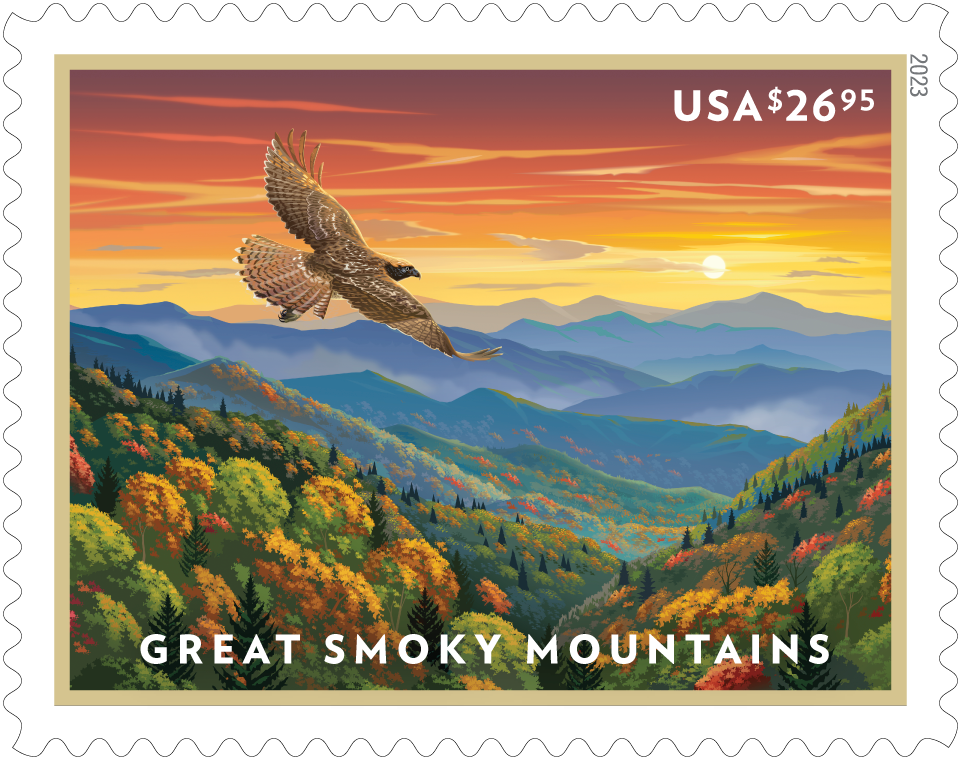 Great Smoky Mountains Stamp (Priority Mail Express) Home to the most visited national park in the United States, the Great Smoky Mountains boast extensive national forests and a vast array of native plants and animals. Equally rich in history, folkways and culture, they are an American treasure, which the Postal Service celebrates with this new Priority Mail Express stamp. The stamp art captures an iconic mountain scene located near Newfound Gap between Gatlinburg, TN, and Cherokee, NC. In the foreground, a red-tailed hawk flies over the landscape. Art director Greg Breeding designed the stamp with original art by Dan Cosgrove. One of the main entrances to Great Smoky Mountains National Park is located in Gatlinburg. It is located at the base of Mount Le Conte, the tallest mountain in the Great Smoky Mountains range, rising 5,301 feet from its base to its 6,593-foot summit. |