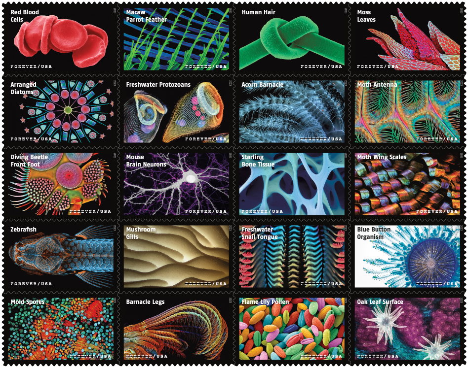 Life Magnified Forever Stamps These stamps reveal life on Earth as many have never seen it. Twenty stamps feature 20 different images taken with microscopes and highly specialized photographic techniques that capture details of life undetectable by the human eye. The images show the phenomena of life in exquisitely fine detail. While stunning on their own as works of art, these images also hold scientific significance. |