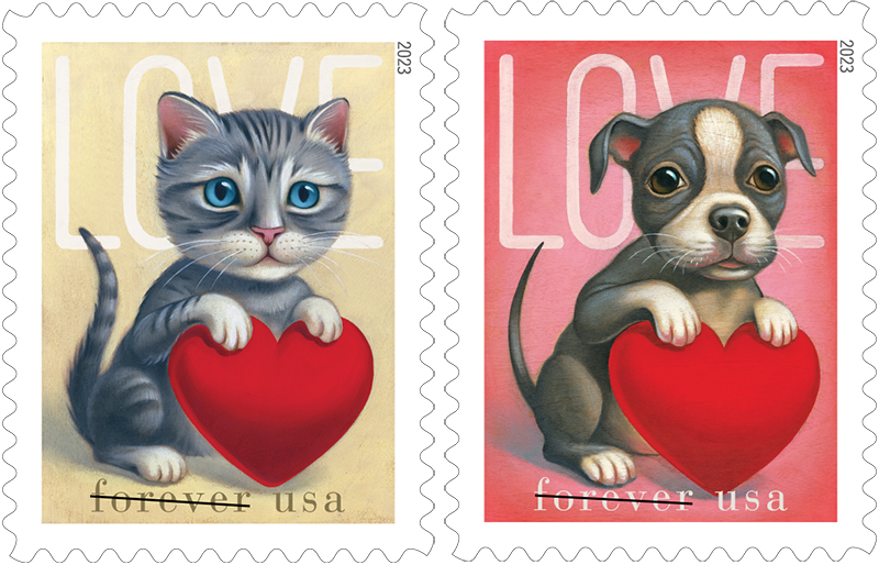 Love Forever Stamps Celebrate 50 years since the first Love stamp was issued with two new Love stamps, one featuring a kitten and the other a puppy with their front paws resting atop a big heart. The word “LOVE” is featured in all caps behind each animal. The stamp designs were painted with oils on wood panel, then scanned and edited digitally. Art director Ethel Kessler designed the stamps with original art by Chris Buzelli. |