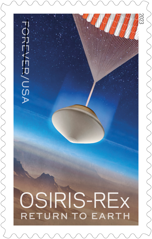 OSIRIS-REx Asteroid Mission Forever Stamp With this new stamp, the U.S. Postal Service celebrates NASA’s seven-year OSIRIS-REx mission to study and map the asteroid Bennu and deliver a sample of the surface to Earth, landing in the Utah desert on September 24, 2023. The sample will help scientists learn how the solar system formed. OSIRIS-REx–a collaboration between NASA, the University of Arizona, and Lockheed Martin–exemplifies American ingenuity, perseverance, and teamwork. The remarkable journey is described in the attached article below. Click for Osiris-Rex article [pdf document] |