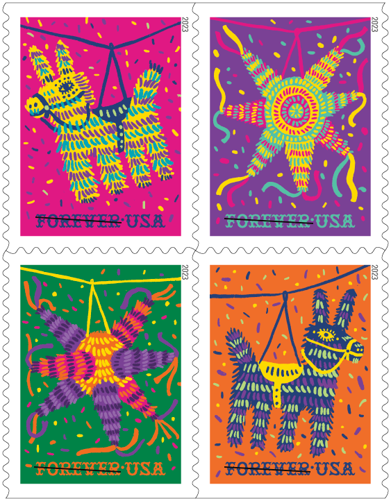 Celebrate the fun and tradition of piñatas with a colorful new booklet of 20 stamps. The stamp art features four lively, digital illustrations of two traditional piñata designs–a donkey and a seven-point star. The bright, saturated color palette was inspired by Mexican culture, including the vibrant colors of small-town houses, traditional hand-sewn dresses, handmade toys and flowers, and classic piñatas themselves. Víctor Meléndez created the original art and designed the stamps. Antonio Alcalá was the art director. The 36th annual Piñata Festival will be held by the Roswell, N.M., Hispano Chamber of Commerce. Described as a family friendly event with lots of vendors, food, and fun, it will be on the Chaves County Courthouse Lawn on September 8, 9, and 10, with a dedication ceremony of the new USPS Piñata stamps at 6 p.m. on Friday, September 8. |