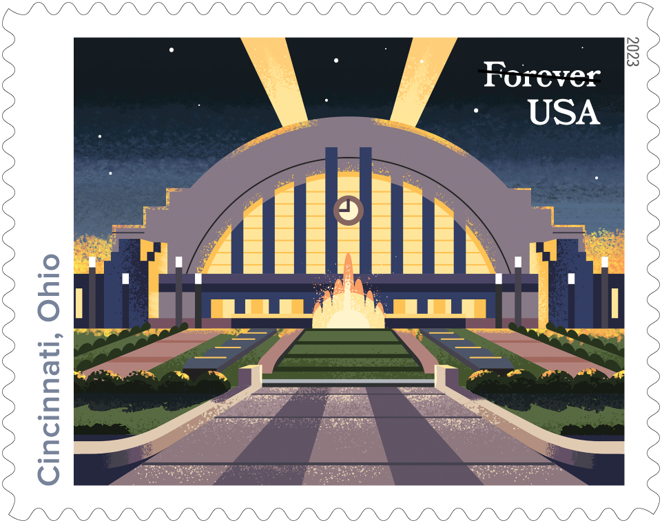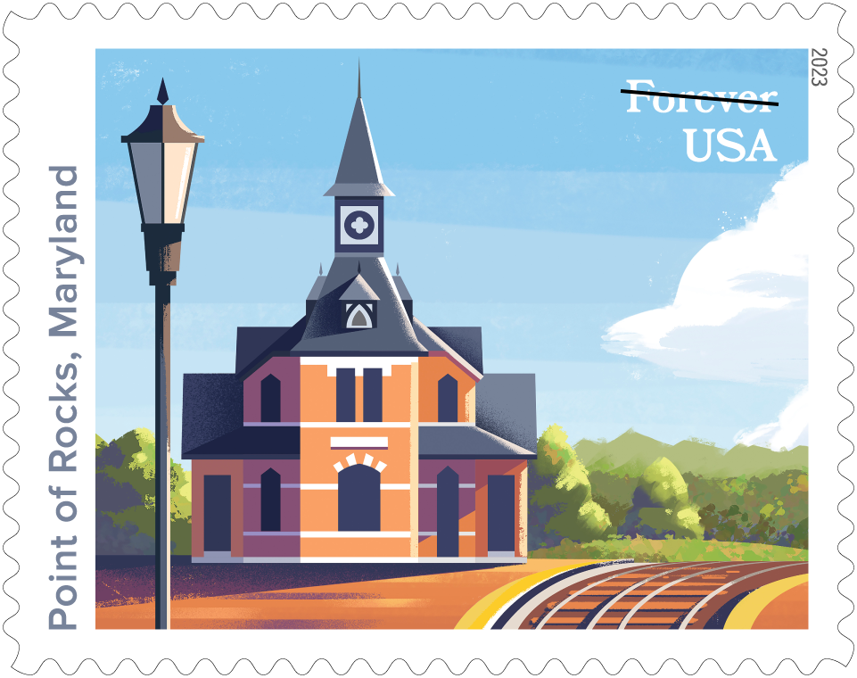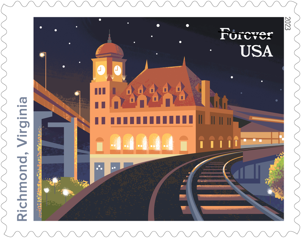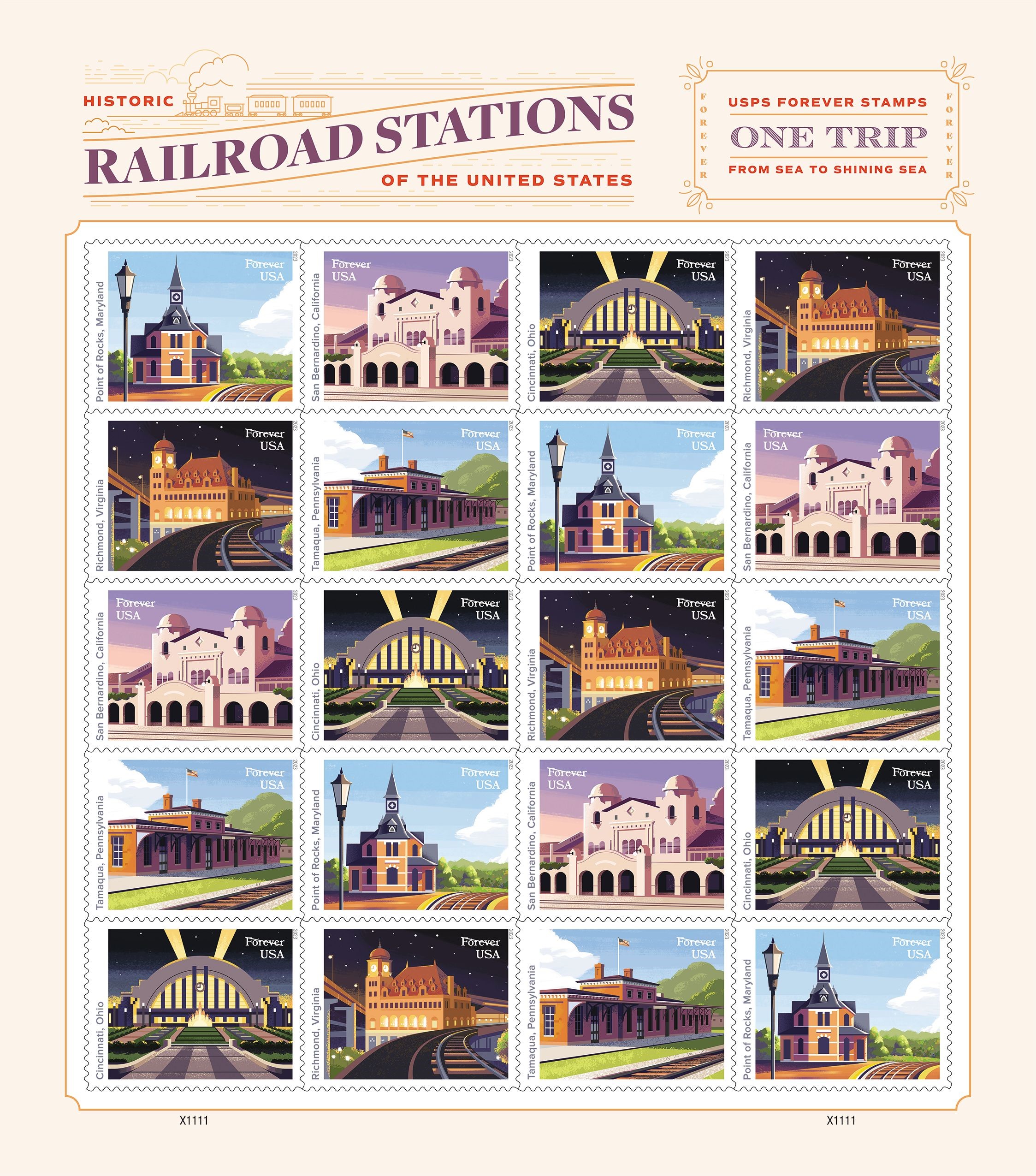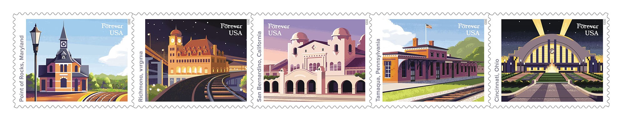 Railroad Stations Forever Stamps Noteworthy railroad stations began brightening the American landscape by the 1870s and, although many were torn down once they had outlived their original purpose, hundreds survived. This issuance of 20 stamps features five architectural gems that continue to play important roles in their communities: Tamaqua Station in Pennsylvania; Point of Rocks Station in Maryland; Main Street Station in Richmond, VA; Santa Fe Station in San Bernardino, CA; and Union Terminal in Cincinnati, OH. Passenger trains stop at all of them except Tamaqua. Derry Noyes served as art director. Down the Street Designs created the digital illustrations and typography. |