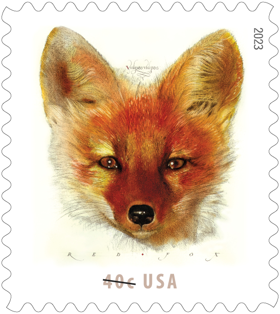 This 40-cent stamp is intended for use by bulk mailers for items such as circulars, newsletters, and catalogs. It can also be used by customers who enjoy placing a variety of stamps on their envelopes and packages. The stamp art features a pencil-and-watercolor illustration of the face of a red fox from preexisting artwork by wildlife illustrator Dugald Stermer (1936–2011). The Red Fox is the largest of the true foxes and one of the most widely distributed, throughout the entire Northern Hemisphere. Due to its presence in Australia, it is included on the list of the world’s 100 worst invasive species. Despite that status, the Red Fox is a popular subject for U.S. stamps, having been featured previously on a $1 1998 stamp, and one of the eight stamps in the 1975 CAPEX souvenir sheet. |