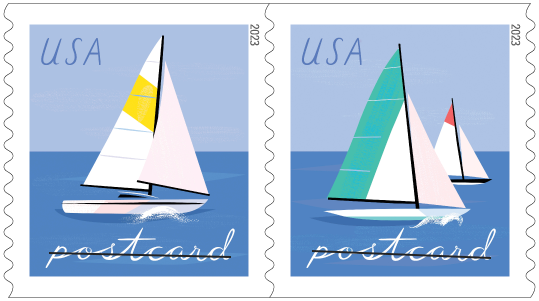 Sailboats Postcard Rate Stamps Sailboats stamps celebrate a favorite American outdoor activity with two colorful new postcard stamps. They feature abstract illustrations that are intended to capture the joyful sensation of being on the water on a beautiful day. The graphic art was designed and created by artist Libby VanderPloeg, who also created the lettering for the word "postcard," freehand on a digital tablet. Antonio Alcalá was art director for the project. Lahaina's popularity as a tropical getaway has made its real estate some of the most expensive in Hawaii; many houses and condominiums sell for more than $5 million. Its small boat harbor is home to many sail boat tours and activities. |