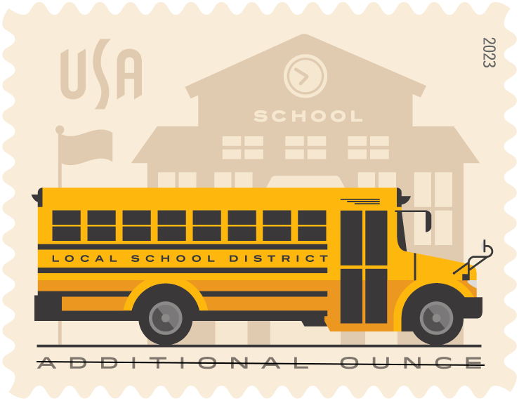 School Bus Non-Denominated Additional Ounce Stamp This stamp celebrates the iconic yellow school bus and its role in ensuring that millions of children get to school and home again every day. The stamp features a stylized illustration of a 21st century yellow school bus, in profile in front of a silhouetted schoolhouse that is intended to be evocative of an earlier era. The first day site, High Point, NC, is the home of Thomas Built Buses, Inc. One of the leading bus manufacturers in the USA, the firm on its website proudly tells us, “Today, one in every three children in North America who rides a bus to school or an activity rides a Thomas Built bus.” |