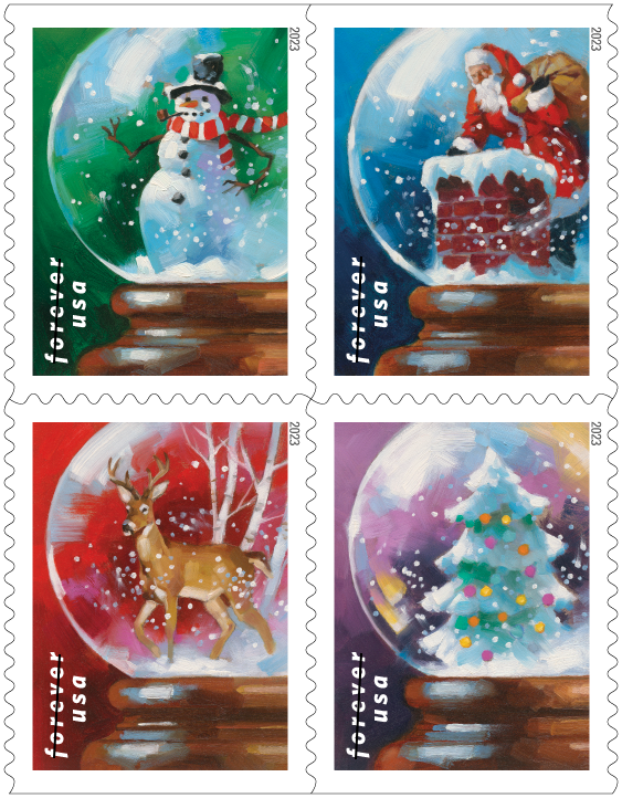 Snow Globes Forever Stamps Beloved by children and adults alike, snow globes can be miniature works of art, kitschy souvenirs or anything in between. Celebrating the spirit of the holidays, the Postal Service captures the playful pleasure of Christmas snow globes on four new stamps. Painting in oil, the artist created spherical snow globes featuring icons of the season: a snowman wearing a jaunty red-and-white scarf; Santa Claus on a rooftop preparing to climb down the chimney; a reindeer standing in a snowy forest; and a snowy tree decorated with colorful ornaments. Art director Derry Noyes designed the stamps with original art by Gregory Manchess. Per Wikipedia, "At the end of the 19th century the Austrian Erwin Perzy, a producer of surgical instruments, invented the so-called Schneekugel (snow globe) and got the first patent for it. Originally his goal was to develop an extra bright lightsource for use as a surgical lamp. As he tried to intensify the candlepower of a so-called Schusterkugel (a water-filled flask used to focus light since the Middle Ages) with particles made out of different materials for reflection purpose, the effect reminded him of snowfall. He then built his first scene globe. Because of the great demand, Perzy and his brother opened a shop in Vienna, where the production continues today as a family business exporting throughout the world. The material and methods used to make the particles for Perzy globes is a family production secret." |