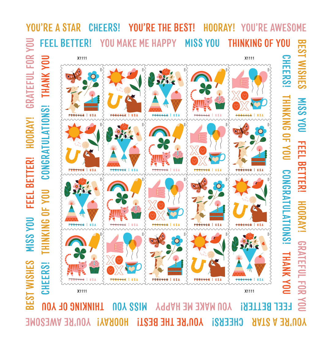 Thinking of You Forever Stamps Capturing the excitement and delight of receiving a card in the mail meant just for you, Thinking of You features five stamps in a pane of 20 and a host of die-cut, self-adhesive messages–perfect to accompany letters or cards sent to brighten someone’s day. Each stamp is designed in fun colors with different whimsical images, including flowers, balloons, cute animals, sweet treats and symbols of good luck. Words of encouragement and thoughtful affirmations surround the stamps on the pane. Art director Greg Breeding designed the stamps with original artwork by Ellen Surrey. |