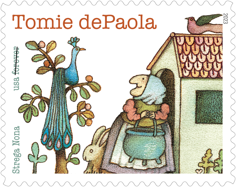Tomie dePaola Forever Stamp This stamp honors prolific children’s book author and illustrator Tomie dePaola (1934-2020), whose extraordinarily varied body of work encompasses folktales and legends, informational books, religious and holiday stories, and touching autobiographical tales. The stamp art features a detail from the cover of “Strega Nona” (1975), the Caldecott Honor winning first book in the series. Set in southern Italy, the gently humorous story focuses on Strega Nona, “Grandma Witch,” who uses magic to help with matters of the heart and to cure her neighbors’ ills. dePaola’s paternal grandparents came to the U.S. from Calabria, which is why he set Strega Nona in southern Italy. dePaola spent much of his life in New Hampshire from the 1970s till he died in 2020. The Currier Museum of Art in Manchester exhibited more than 100 of his illustrations in 2020 and 2021 and recently established the Tomie dePaola Art Education Fund to support art education for young people of all backgrounds. |