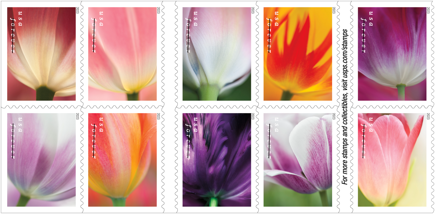 Tulip Blossoms Forever Stamps Americans love tulips, but these spectacular flowers have roots in Central Asia. Traded along the Silk Road, they were first cultivated in 10th-century Persia and, by the 16th century, were all the rage in Constantinople (now Istanbul, Turkey). In fact, “tulip” derives from a Turkish version of the Persian word for “turban,” an allusion to the flower’s shape. After diplomats in Constantinople shipped bulbs home to western Europe, the Dutch developed effective ways to cultivate and market the flower. The tulip trade remains an important part of their nation’s economy 400 years later. Dutch immigrants brought tulip bulbs to America, perhaps as early as the 1600s. The flower has become a dazzling part of the landscape here, and the United States now imports more than 1 billion bulbs per year. Tulips can be grown in most of the country, outside of the Deep South, and gardeners can choose among thousands of varieties. Greg Breeding, an art director for USPS, designed the stamps with existing photographs by Denise Ippolito. Ippolito photographed the 10 different tulips in gardens and parks she encountered while traveling. A single flower, shot in close-up, fills almost the entire frame of each stamp, with just the top of the stem showing. The tulips are various shades of yellow, orange, pink, green and violet. |