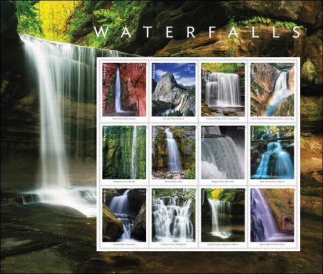 Waterfalls Forever Stamps Among nature's most beautiful wonders, waterfalls come in all shapes and sizes, from serene cascades to mighty cataracts. The Postal Service celebrates the variety and beauty of American waterfalls with 12 new stamps. Each stamp features a photograph with the name of the waterfall and state in which it is located. Art director Greg Breeding designed the stamps and pane with existing photographs. |