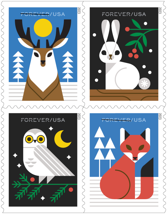 Connect to the natural beauty of the winter season and celebrate four species that make their homes in the woodlands of North America. Among the most familiar of wildlife, deer, rabbits, owls and foxes are found across much of the American landscape. This booklet of 20 stamps features graphic illustrations of these four animals in different woodland settings in winter. Art director Antonio Alcalá designed the stamps with Katie Kirk, who illustrated the stamps. |
