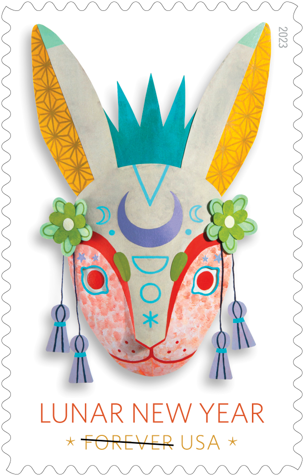 The first commemorative to be released in the Gregorian calendar new year will be the Year of the Rabbit stamp—for the Lunar Year that runs from January 22, 2023 until February 9, 2024. San Francisco was chosen for the First Day of Issue because it has a large Asian population that will be celebrating the Lunar New Year. Calling to mind the elaborately decorated masks used in the dragon or lion dances often performed in Lunar New Year parades, this 3-dimensional mask depicting a rabbit is a contemporary take on the long tradition of paper-cut folk-art crafts created during this auspicious time of year. This is the fourth of 12 stamps in the latest USPS Lunar New Year series, as well as in the Chinese Zodiac. The 12 animals in the Chinese Zodiac are, in order, the Rat, Ox, Tiger, Rabbit, Dragon, Snake, Horse, Goat, Monkey, Rooster, Dog, and Pig. |